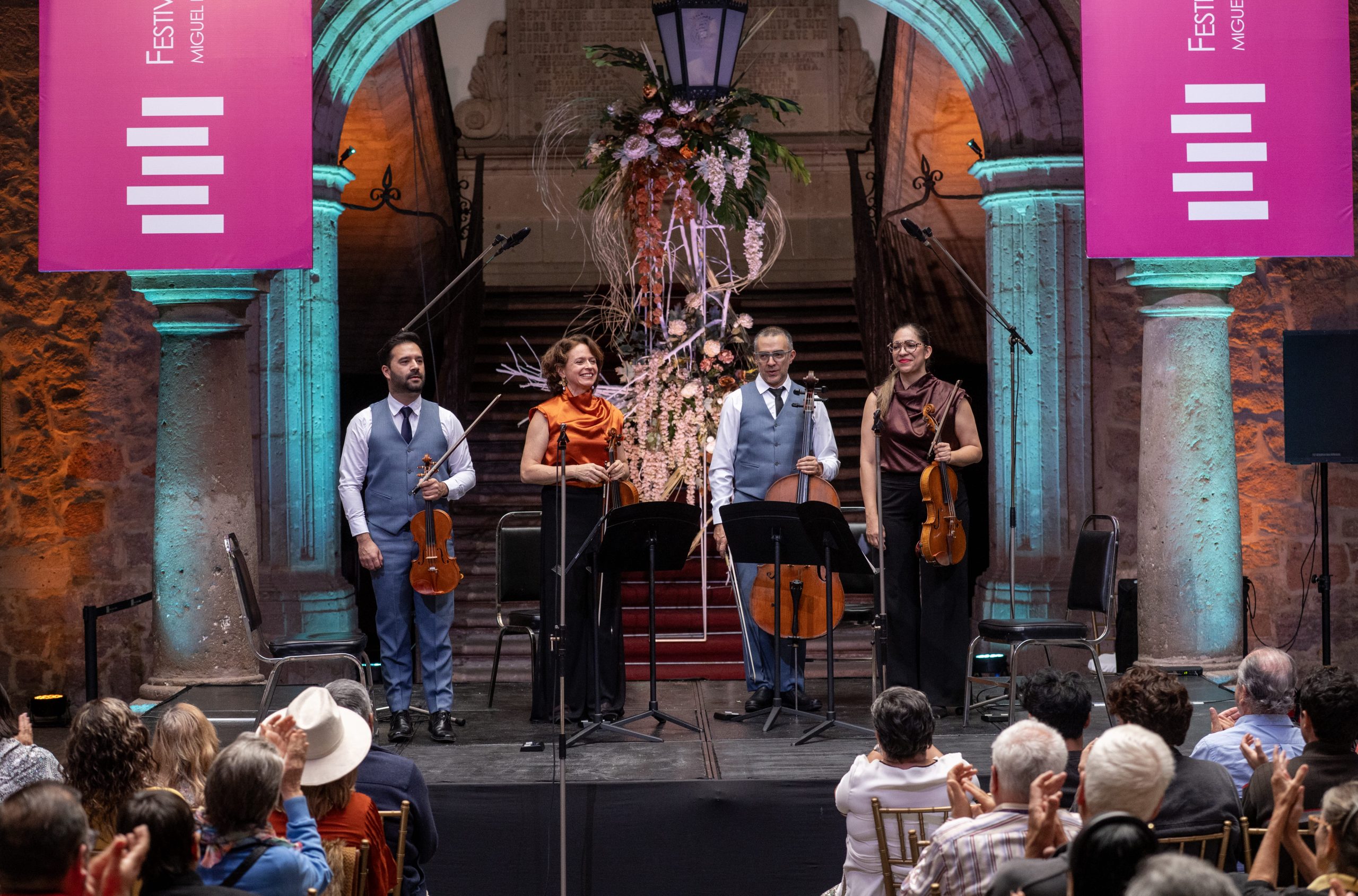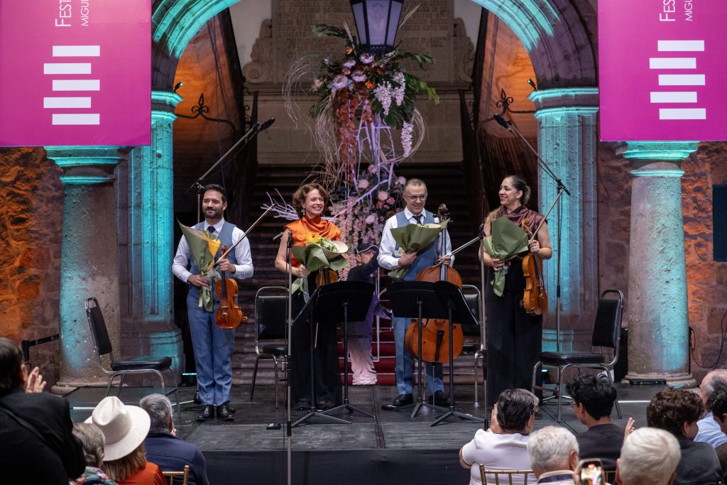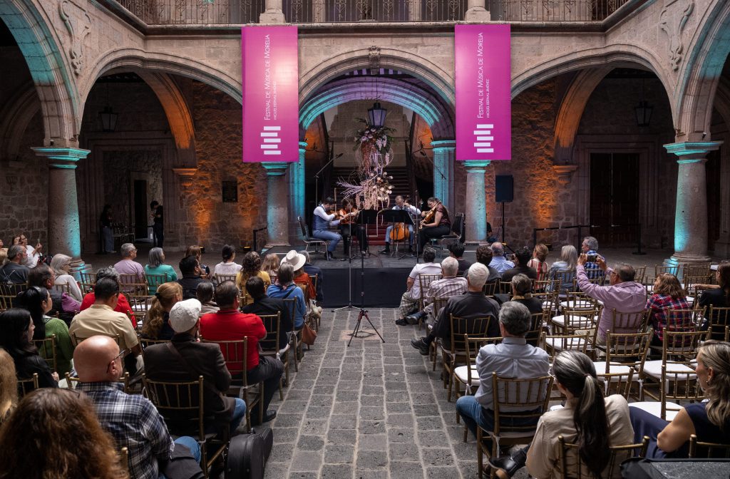 Morelia, Mich., 17 de noviembre de 2025.- La tarde del lunes, el Palacio Municipal se llenó de historia y emoción con la presentación del Cuarteto Q-Arte en el marco del Festival de Música de Morelia Miguel Bernal Jiménez, ofreciendo a las 13h un concierto que recorrió la riqueza de la música de cámara de México y Latinoamérica.